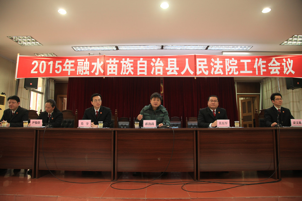 会议由法院党组成员,副院长尹俊群主持。会上首先对荣获县法院系统先进集合和个人进行了表彰。县委常委,政法委书记潘劲涛在会上发言,他表示,融水法院全体干警一年来无私奉献、奋力拼搏,连续三年荣获市中院绩效考评一等奖,荣获“全区平安建设先进集体” 和自治区高院“全区优秀法院”、“先进集体”等光荣称号,涌现出李丹联等一批先进的楷模,成绩十分亮眼,县政法委对法院的工作表示满意,他代表县政法委向全院干警致以亲切的问候。希望法院全体干警认真学习贯彻党的十八届四中全会精神,紧紧围绕县委创建区民族旅游名县的要求,增强服务意识,坚持司法为民,求真务实,扎实工作,履行宪法和法律赋予的职责,各项工作取得新成效,为建设大苗山再立新功。