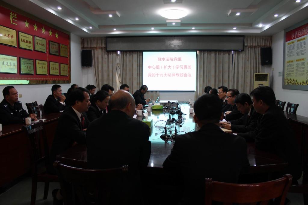 上午十一点,该院召开党组中心组(扩大)专题会议,进一步深入学习贯彻党的十九大精神。会上,党组中心组成员对习近平总书记作的十九大报告、十八届中央纪律检查委员会的工作报告、《中国共产党章程(修正案)》、中国共产党第十九届中央委员会第一次全体会议精神进行全面深刻的学习,各党组成员发表学习十九大精神心得体会并就分管工作各部门在工作中如何认真贯彻落实十九大精神增强大局意识、改进司法作风、提升人民群众满意度作出重要指示,确保该院各项工作沿着正确政治方向健康发展。